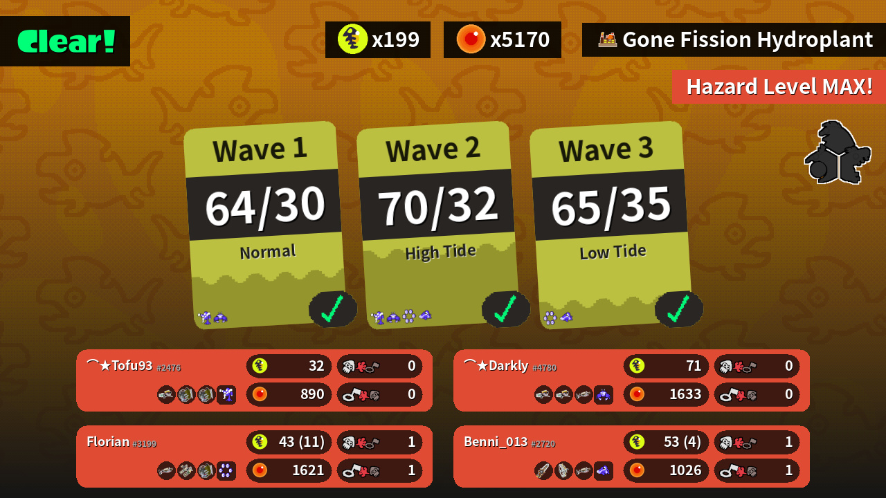 | Weapons | Grizzco Blaster Grizzco Slosher Grizzco Slosher | Grizzco Blaster Grizzco Blaster Grizzco Charger | Grizzco Splatana Grizzco Stringer Grizzco Charger | Grizzco Charger Grizzco Dualies Grizzco Slosher |