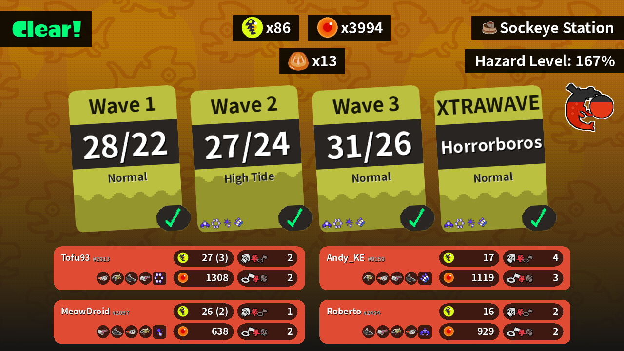 | Weapons | Goo Tuber Splash-o-matic Bloblobber Heavy Splatling | Heavy Splatling Bloblobber Goo Tuber Splash-o-matic | Splash-o-matic Goo Tuber Heavy Splatling Bloblobber | Bloblobber Heavy Splatling Splash-o-matic Goo Tuber |