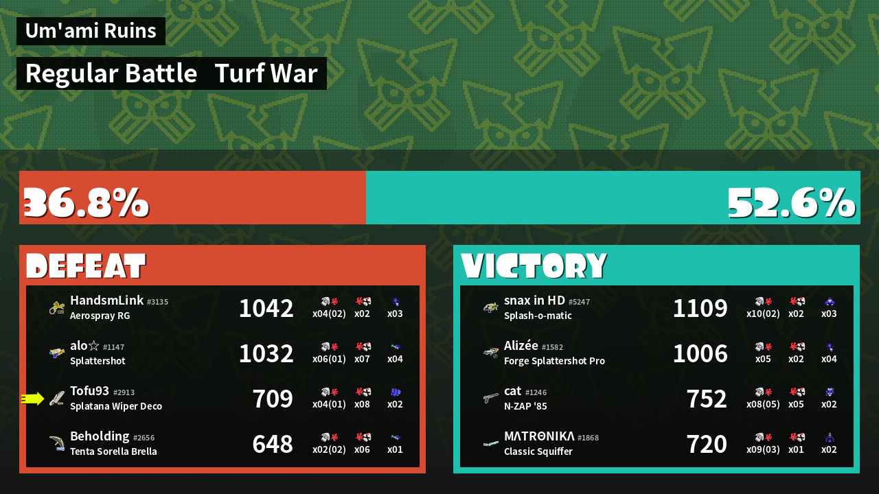 | Medals | #1 Damage Taker #1 Tenta Missiles User #2 Overall Splatter | ||