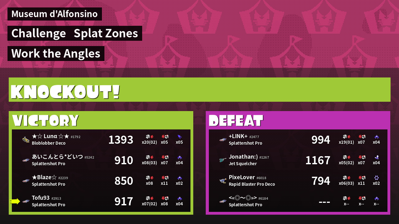 | Medals | #1 Popular Target #2 Splat Zone Guard #2 Turf Inker | ||