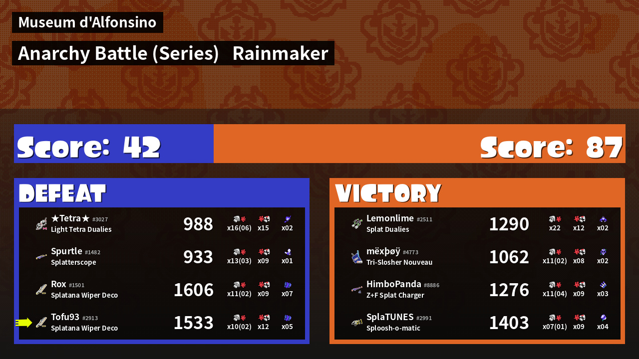 | Medals | #1 Damage Taker #1 Tenta Missiles User #2 Turf Inker | ||