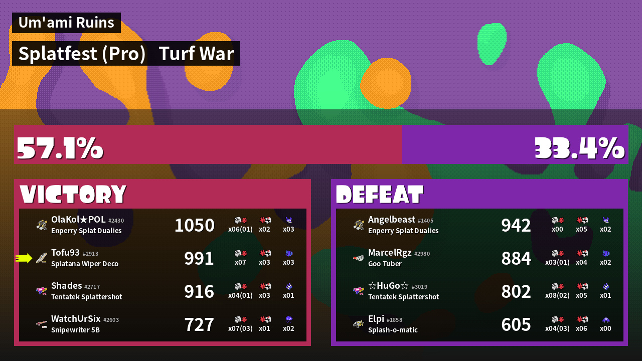| Medals | #1 Overall Splatter #1 Popular Target #1 Enemy-Base Inker | ||