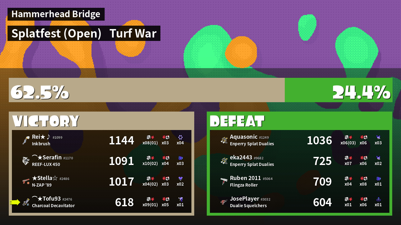 Kills / Deaths | 8 + 1 / 5 > Kill Ratio: 1.60 | ||