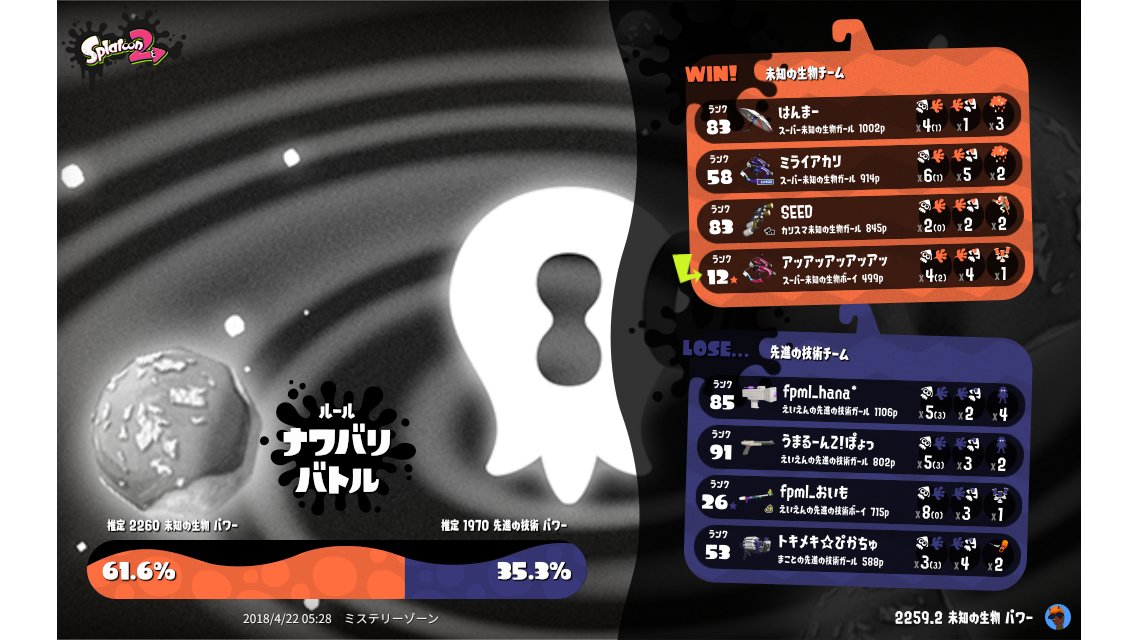 | Splatfest Title | 未知の生物 Defender 48 → 未知の生物 Champion 7 | ||||||||||||||||||||||||||||