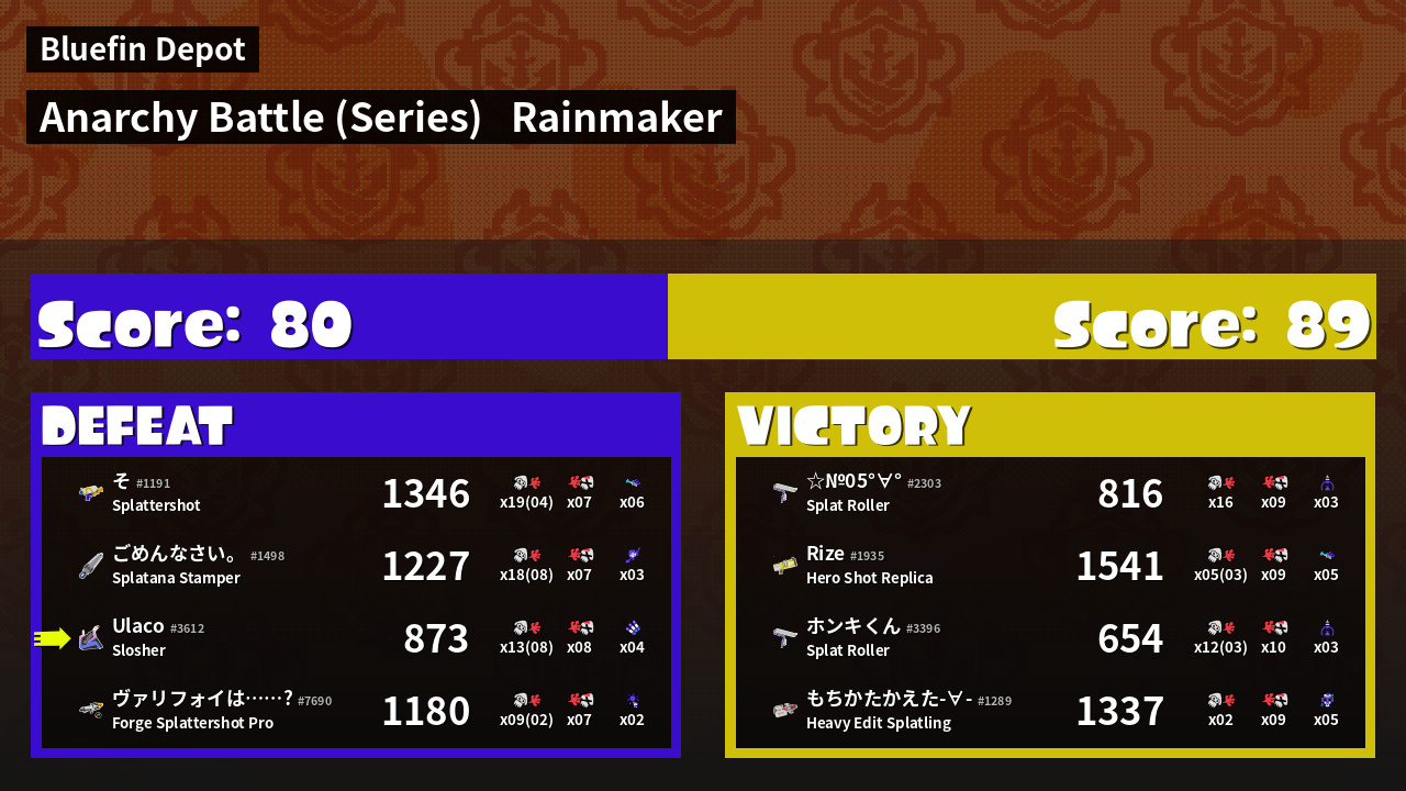 | Medals | #1 Splat Assister #1 Ink Consumer #2 Popular Target | ||