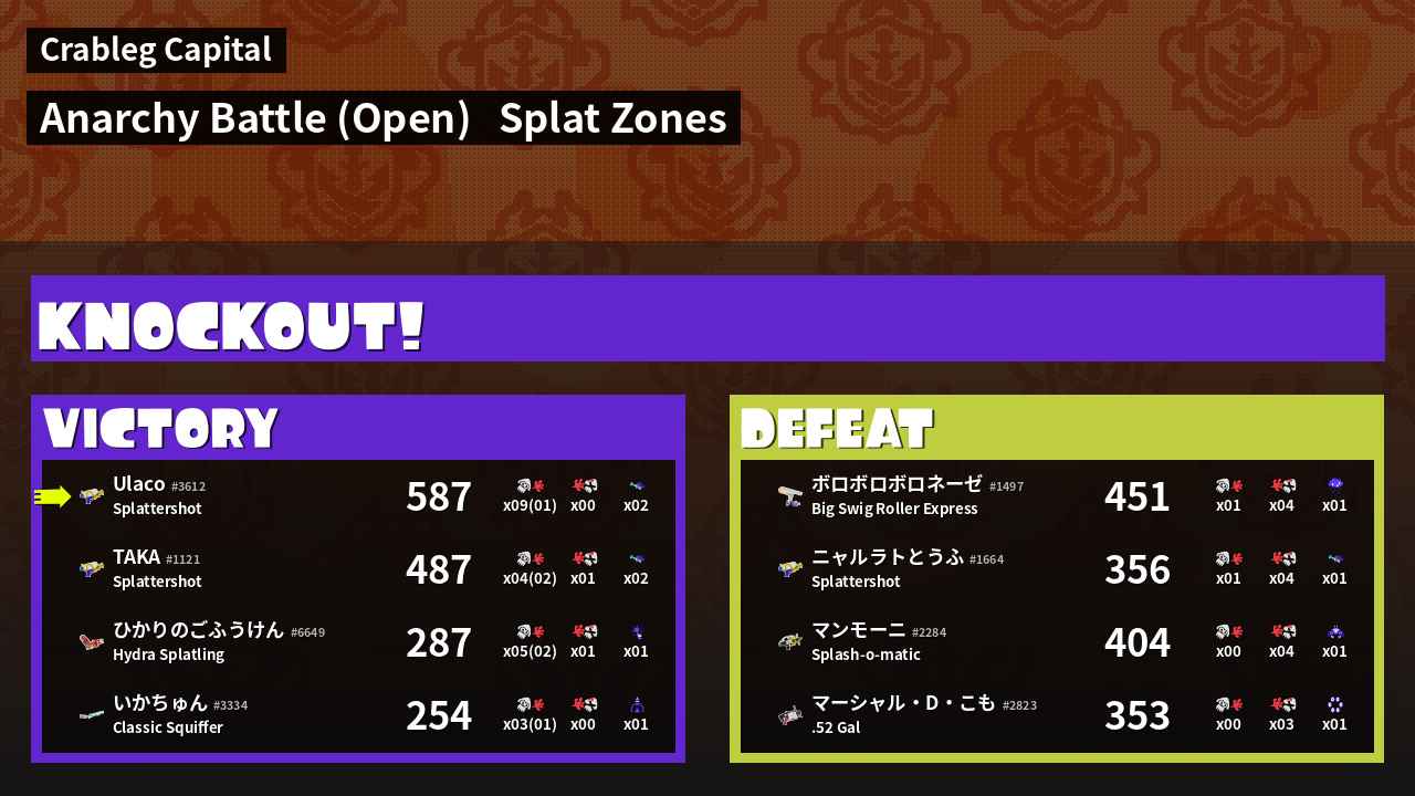 | Mode | Splat Zones - Anarchy Battle (Open) | ||
