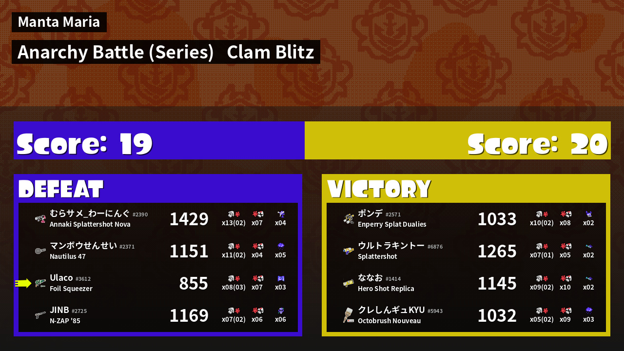 | Medals | #1 Popular Target #1 Splat Assister #1 Splattercolor Screen User | ||