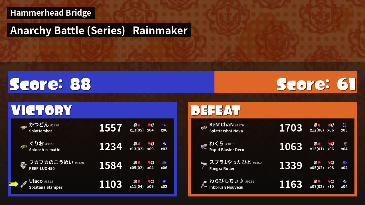 | Medals | #1 Damage Taker #1 Zipcaster User #2 Splat Assister | ||