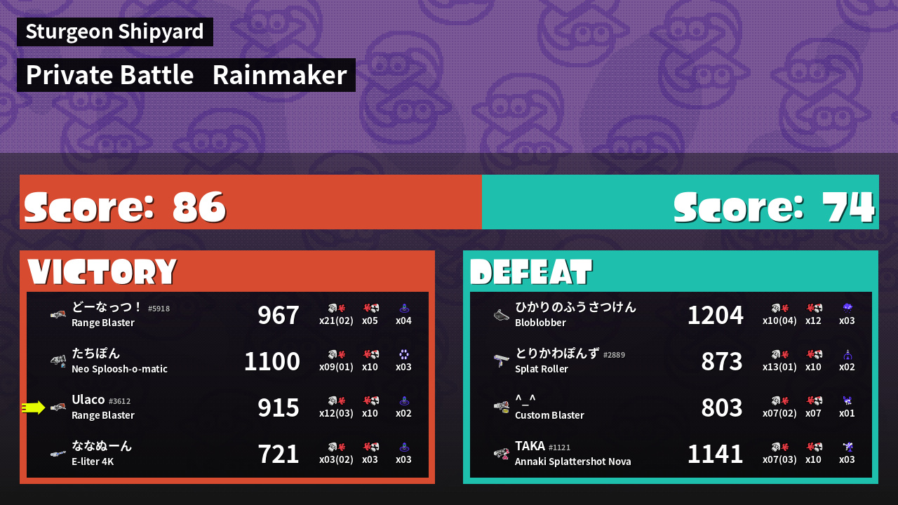 | Medals | #1 Splat Assister #1 Damage Taker #1 Ink Consumer | ||