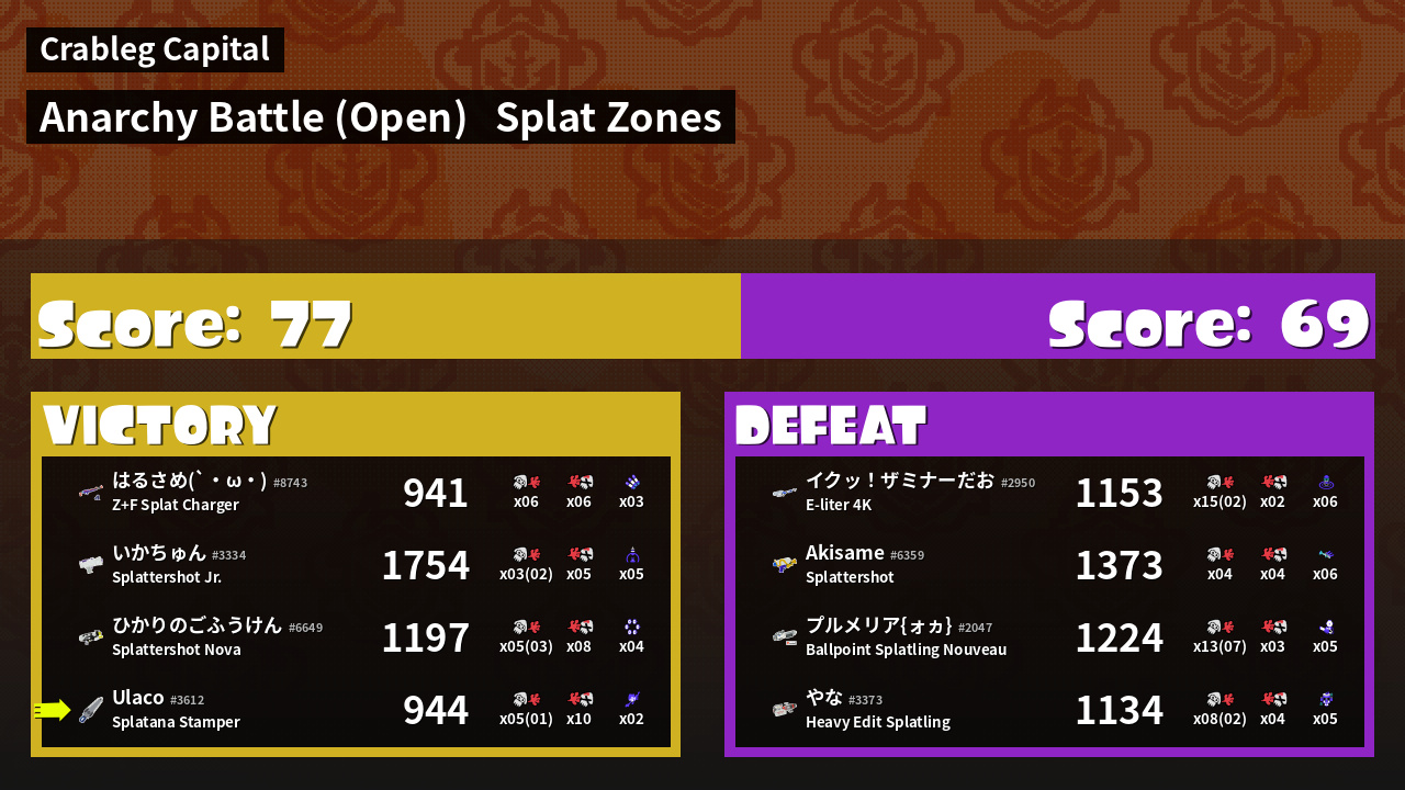 | Mode | Splat Zones - Anarchy Battle (Open) | ||