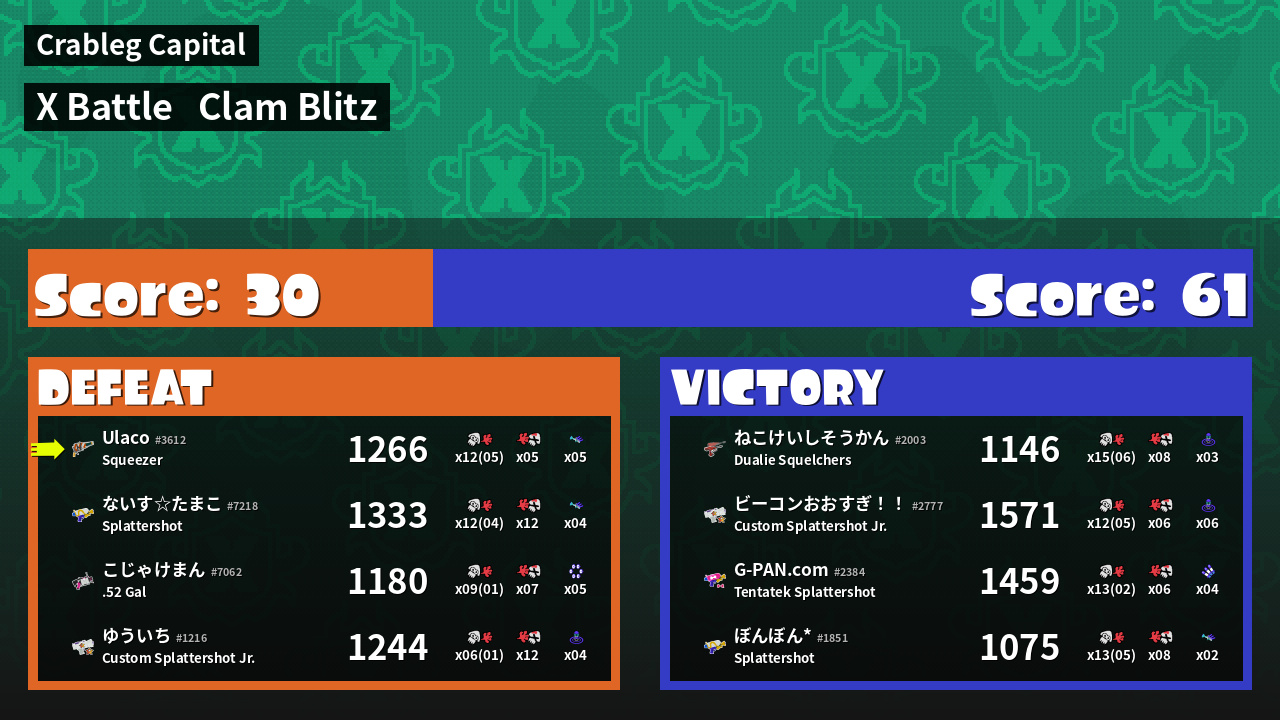 | Mode | Clam Blitz - X Battle | ||