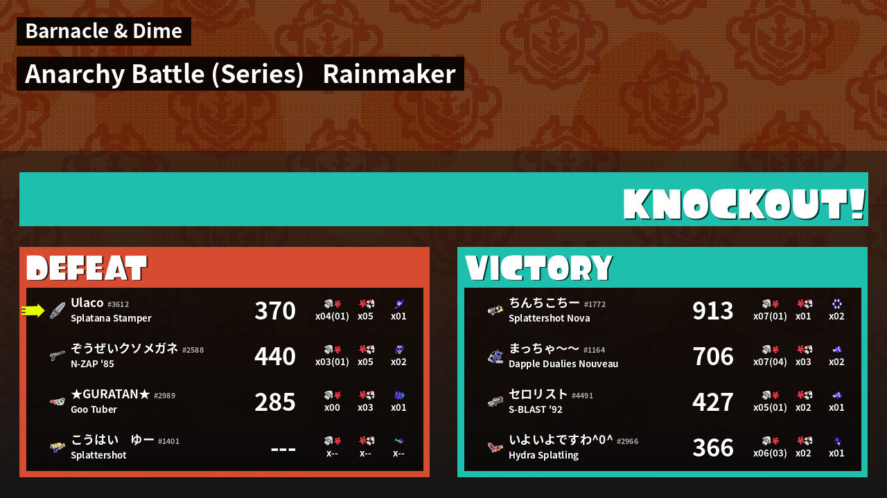 | Medals | #1 Overall Splatter #1 Enemy Splatter #1 Splat Assister | ||