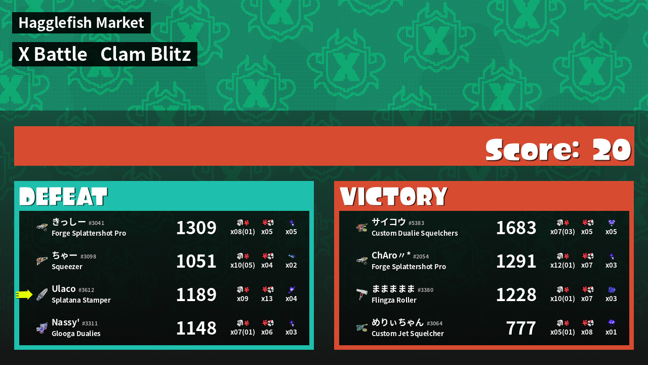 | Medals | #1 Enemy Splatter #1 Clam Stopper #2 Overall Splatter | ||