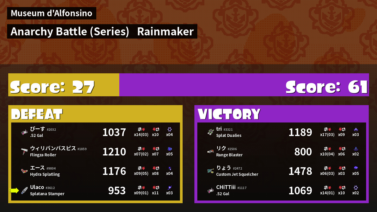 | Medals | #1 Damage Taker #1 Ink Consumer First Splat! | ||
