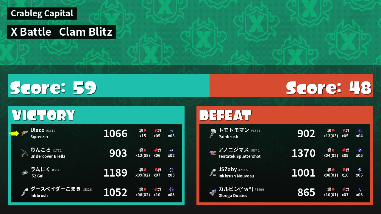 | Mode | Clam Blitz - X Battle | ||