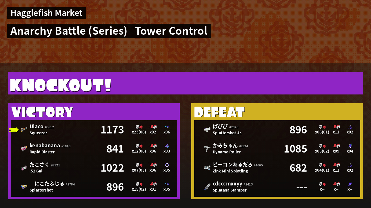 | Medals | #1 Overall Splatter #1 Turf Inker #1 Enemy Splatter | ||