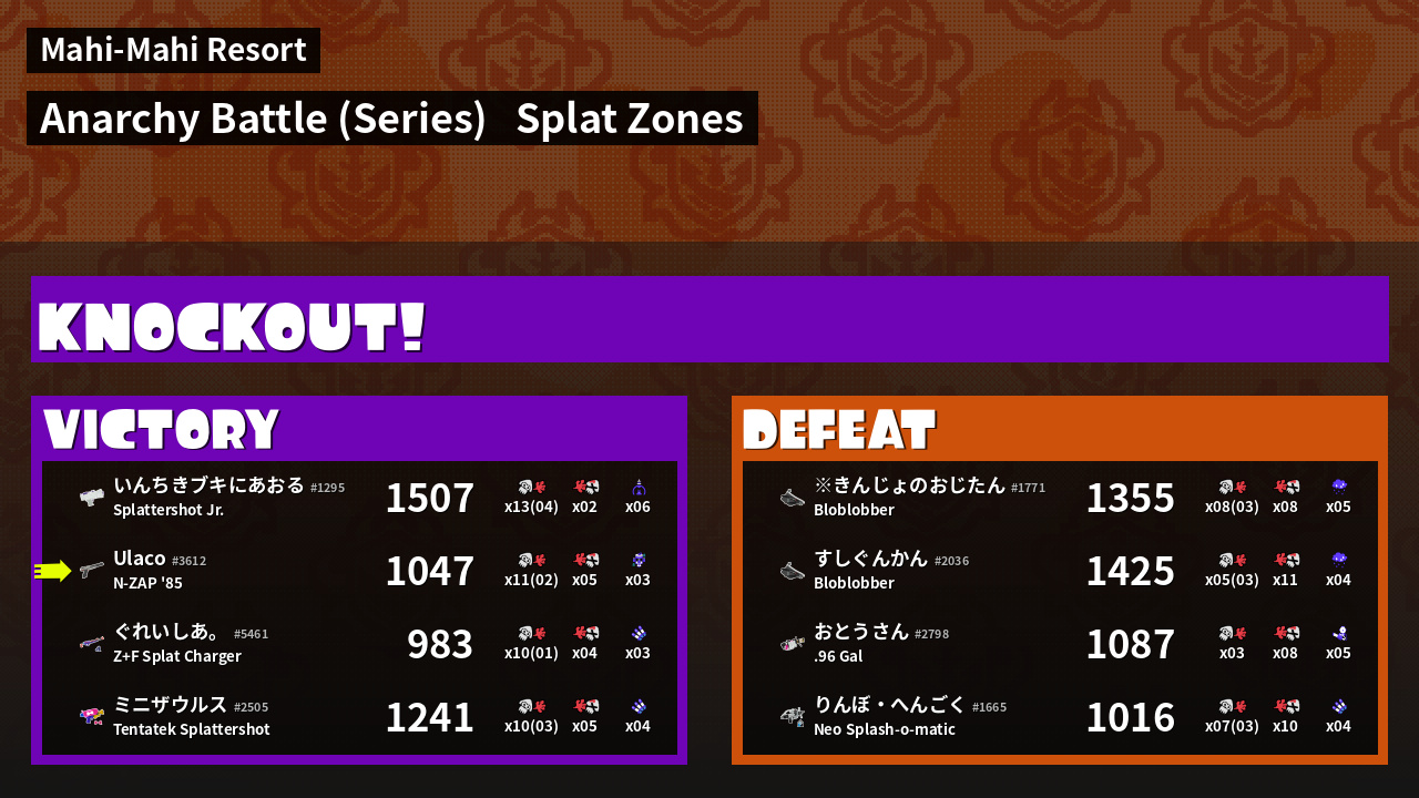 | Medals | #1 Splat Zone Guard #1 Enemy Splatter #1 Tacticooler User | ||