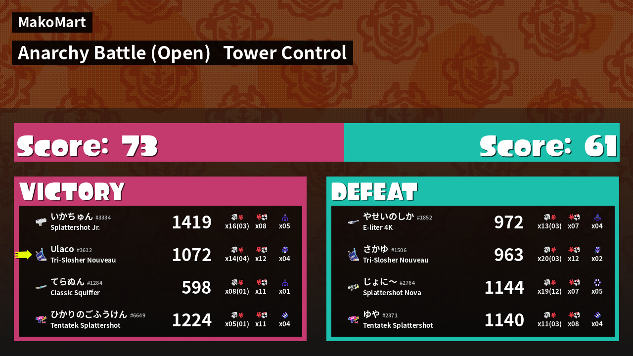 | Medals | Record-Score Setter #1 Splat Assister #1 Tower Stopper | ||