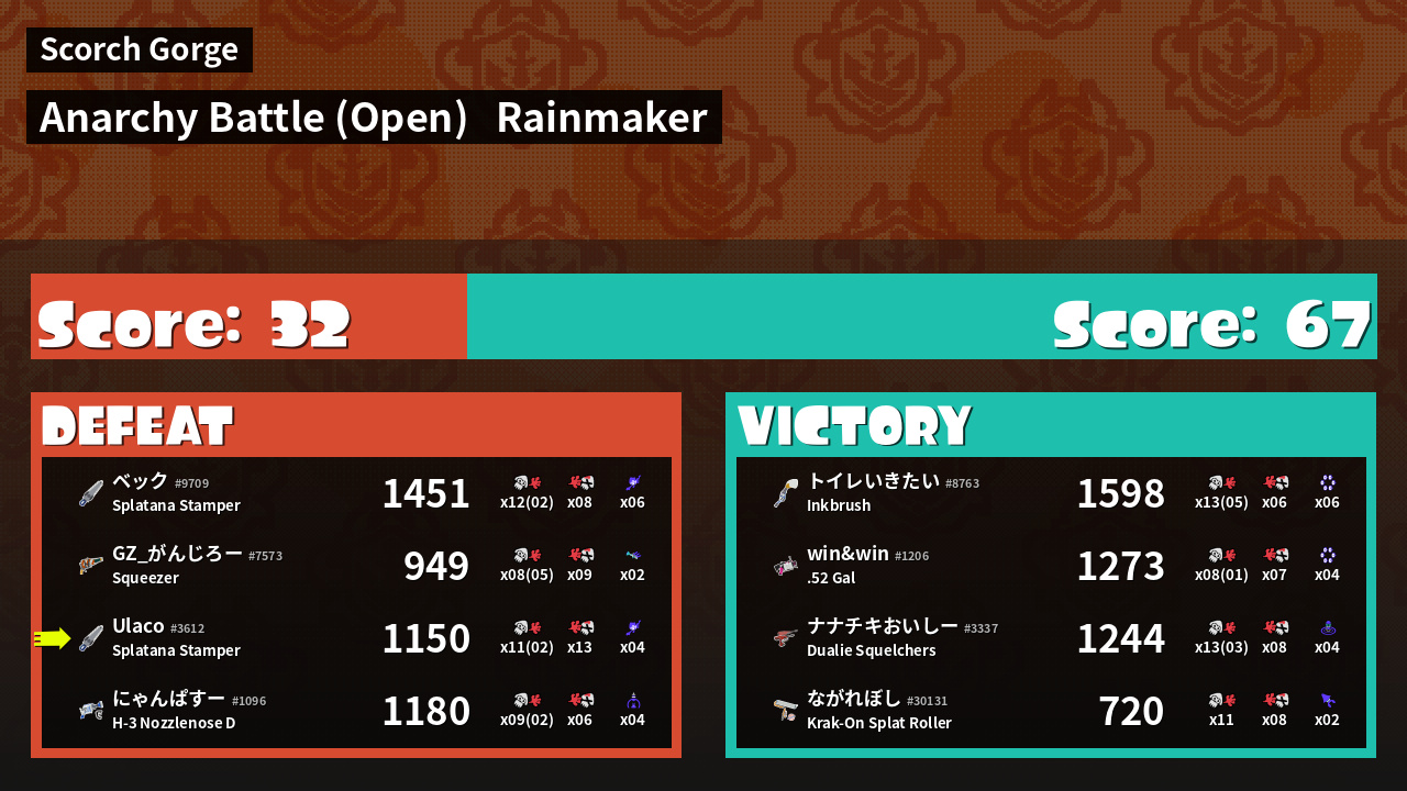 | Medals | #1 Rainmaker Stopper #2 Overall Splatter #2 Enemy Splatter | ||