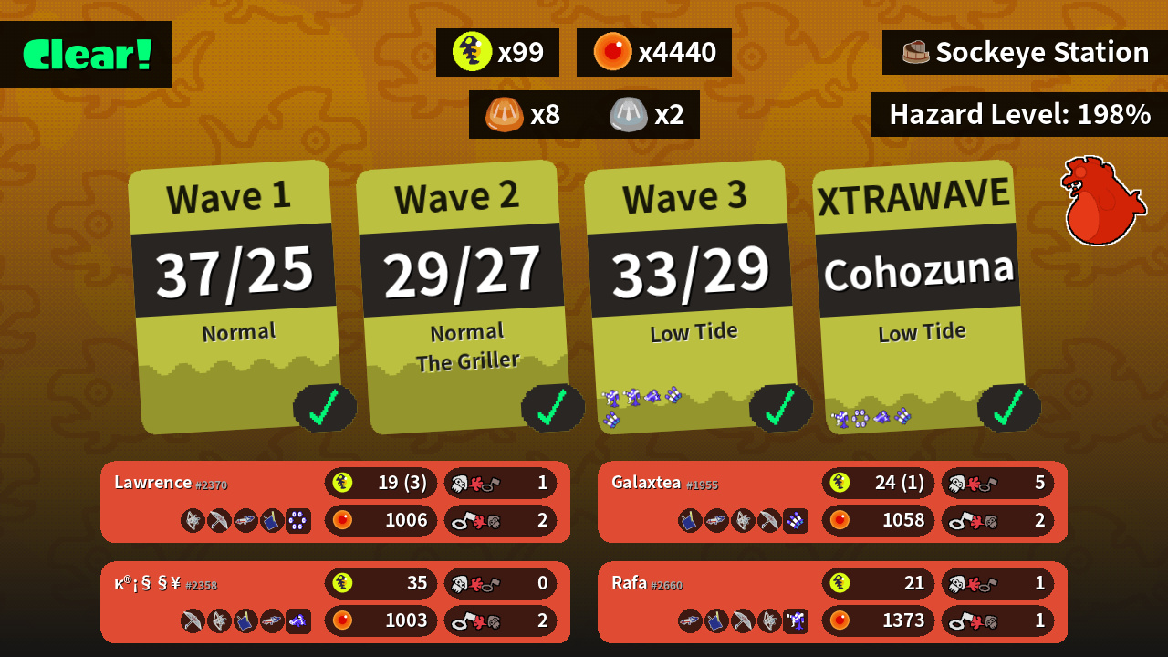 | Weapons | Tri-Stringer Splat Brella Splattershot Pro Tri-Slosher | Splat Brella Tri-Stringer Tri-Slosher Splattershot Pro | Tri-Slosher Splattershot Pro Tri-Stringer Splat Brella | Splattershot Pro Tri-Slosher Splat Brella Tri-Stringer |