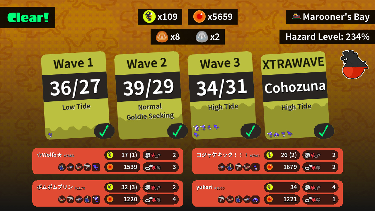 | Weapons | Tri-Slosher Splattershot Pro Hydra Splatling Flingza Roller | Flingza Roller Hydra Splatling Tri-Slosher Splattershot Pro | Hydra Splatling Flingza Roller Splattershot Pro Tri-Slosher | Splattershot Pro Tri-Slosher Flingza Roller Hydra Splatling |