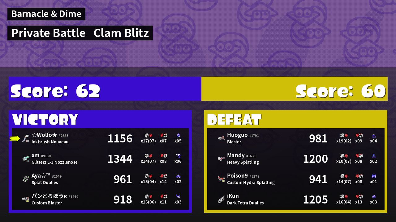 | Mode | Clam Blitz - Private Battle | ||