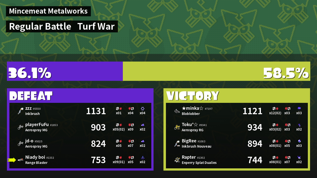 | Medals | #1 Overall Splatter #1 Popular Target #1 Enemy-Base Inker | ||