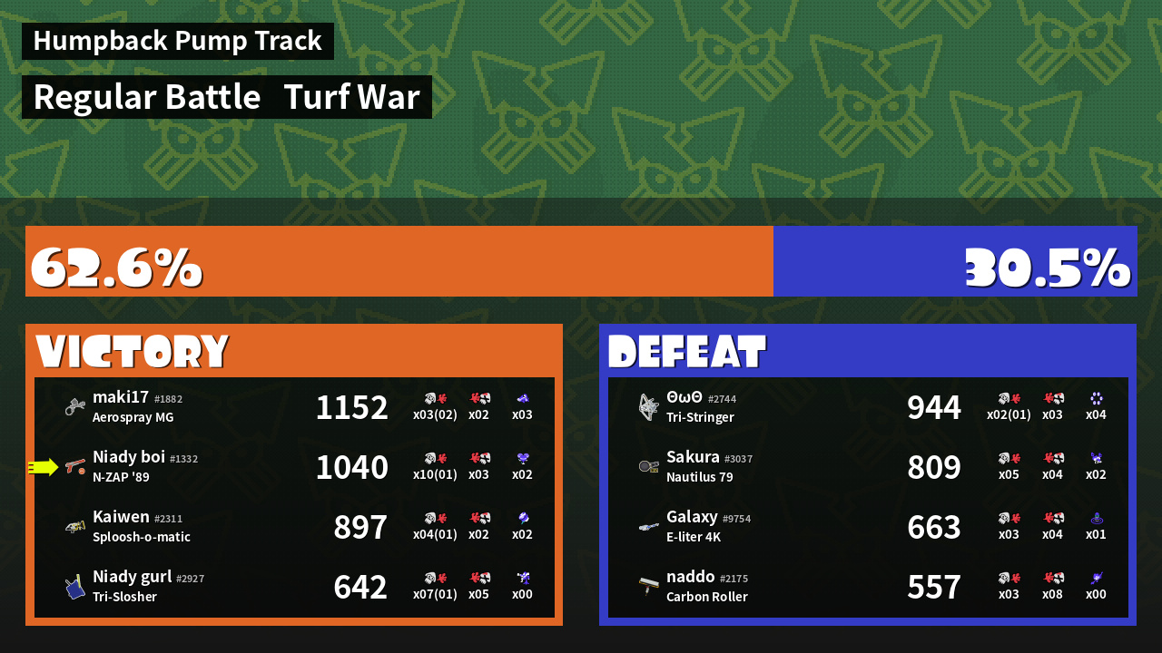 | Medals | #1 Overall Splatter #1 Popular Target #1 Enemy-Base Inker | ||