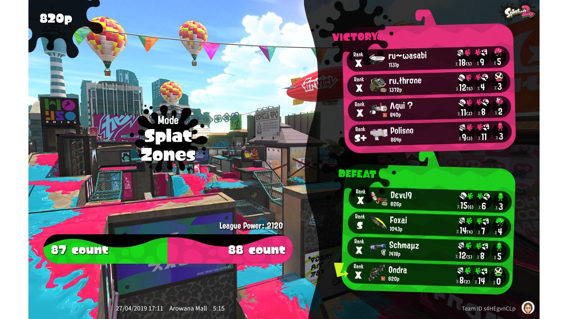 | Mode | Splat Zones - League Battle (Twin) | |||||||||||||||||||||||||||||||||||||