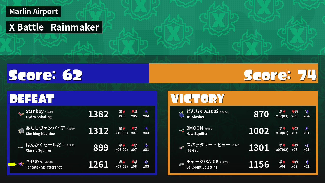 | Medals | #1 Splat Assister #1 Rainmaker Stopper #1 Damage Taker | ||