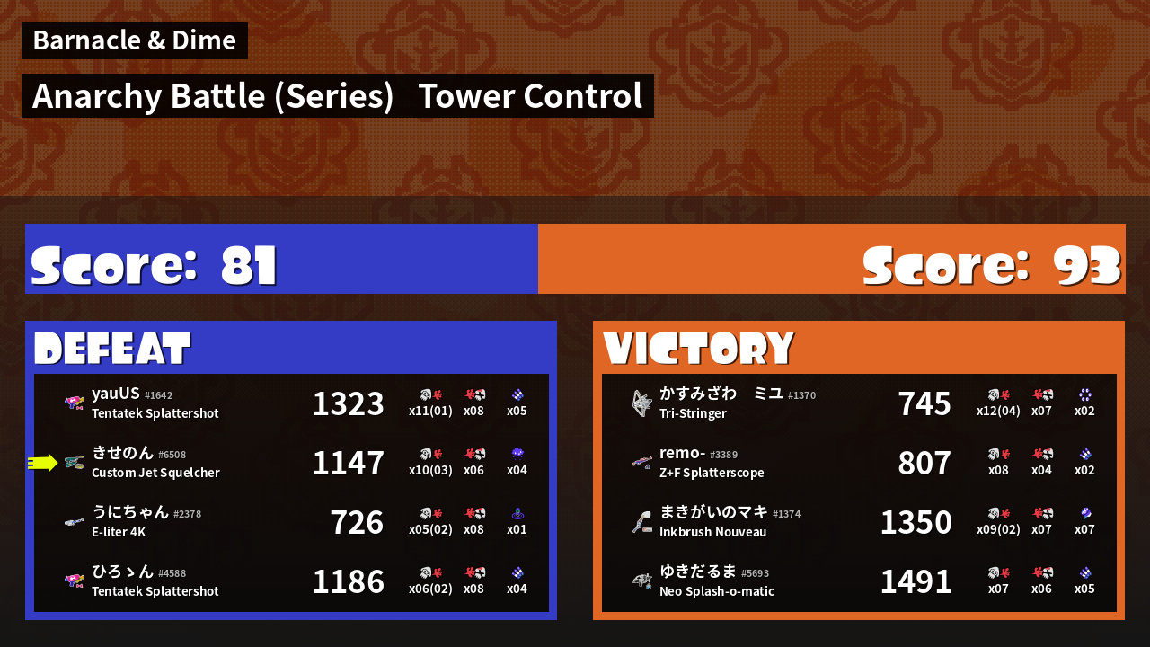 | Medals | Record-Score Setter #1 Splat Assister #1 Tower Stopper | ||