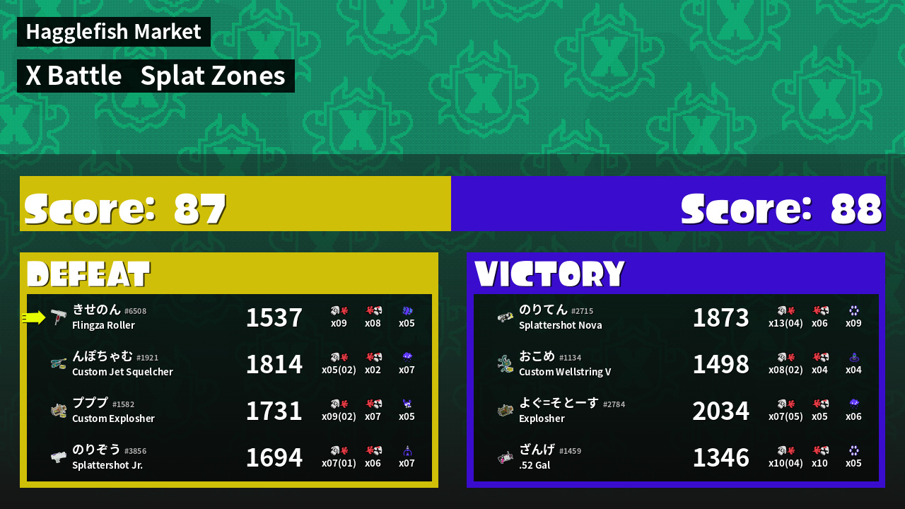 | Medals | #1 Overall Splatter #1 Splat Zone Guard #1 Enemy Splatter | ||
