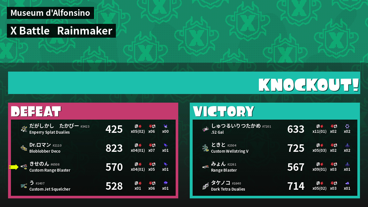| Medals | #1 Super Jump Spot #1 Enemy Splatter #1 Rainmaker Carrier | ||