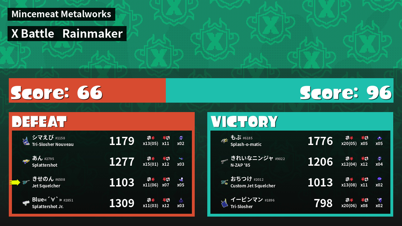 | Medals | #1 Super Jump Spot #1 Splat Assister #1 Ink Vac User | ||