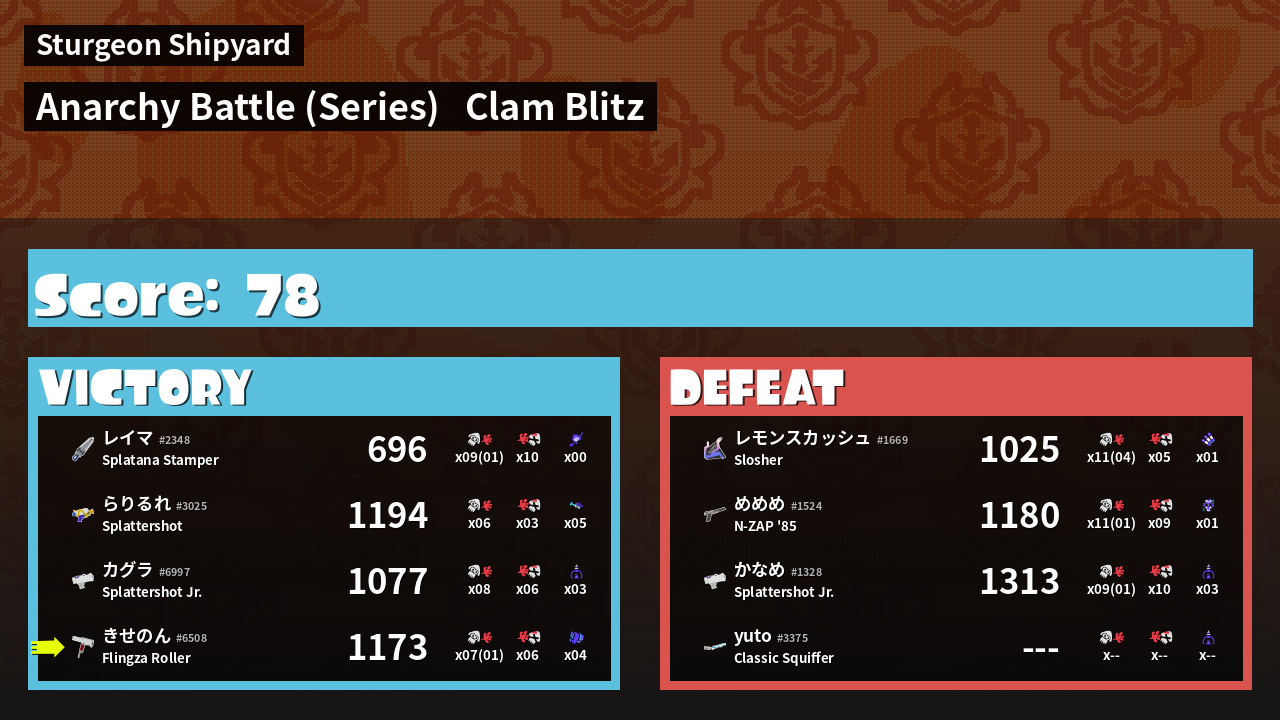 | Medals | #1 Splat Assister #1 Tenta Missiles User #2 Turf Inker | ||