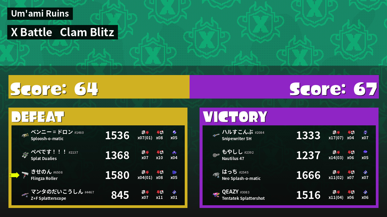 | Medals | #1 Turf Inker #1 Splat Assister #1 Tenta Missiles User | ||