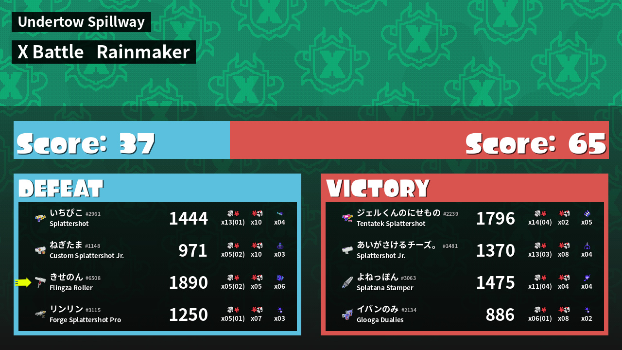 | Medals | #1 Turf Inker #1 Splat Assister #1 Rainmaker Carrier | ||