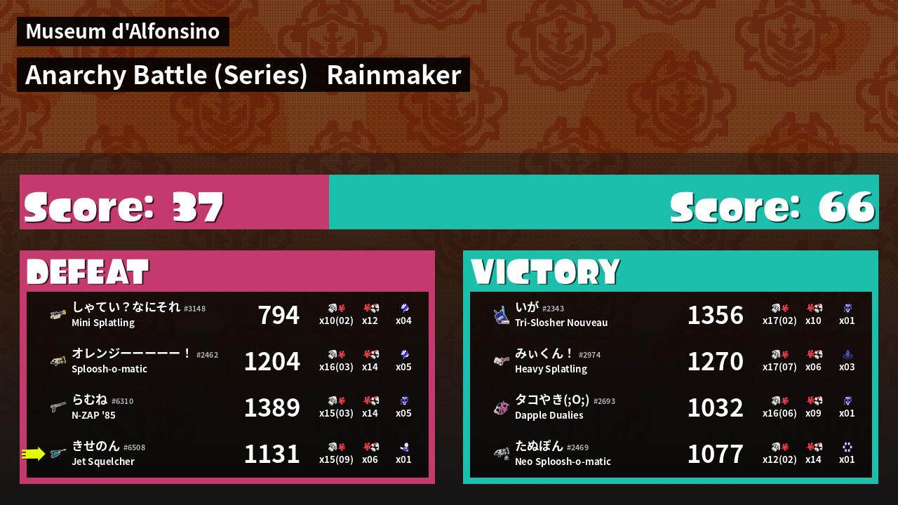 | Medals | #1 Splat Assister #1 Rainmaker Stopper #1 Ink Consumer | ||