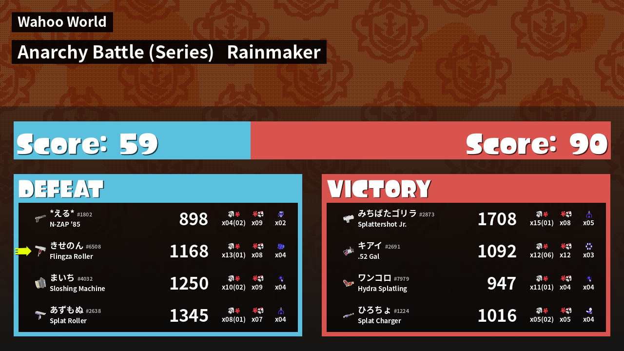 | Medals | #1 Overall Splatter #1 Enemy Splatter #1 Rainmaker Stopper | ||