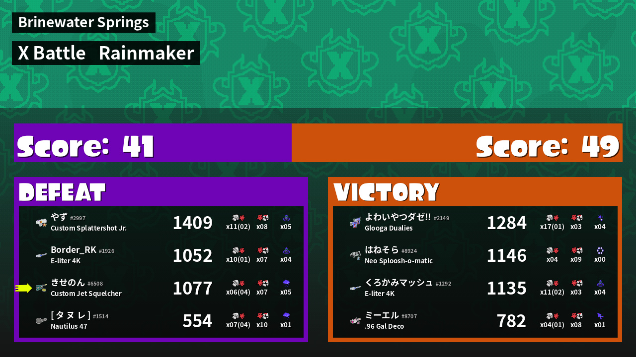 | Medals | #1 Super Jump Spot #1 Splat Assister #1 Ground Traveler | ||