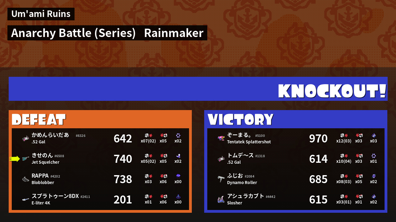 | Medals | #1 Turf Inker #1 Splat Assister #1 Ink Consumer | ||