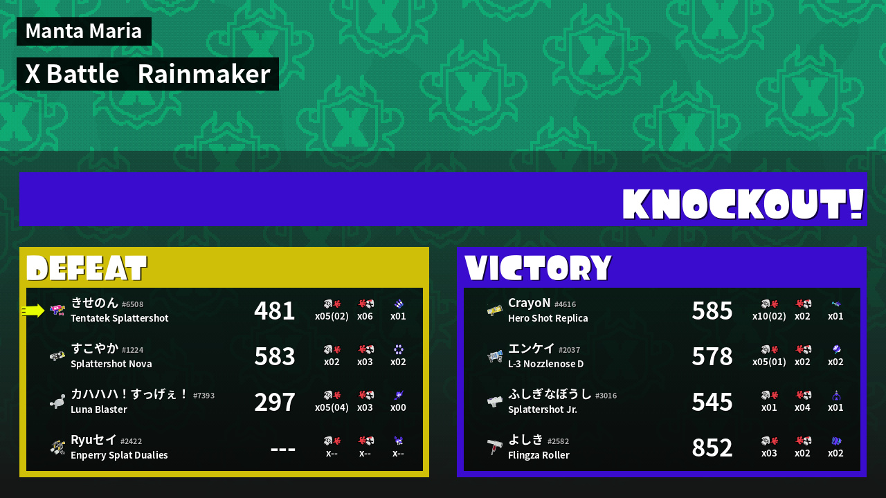 | Weapon | Tentatek Splattershot ( Splat Bomb / Triple Inkstrike) | ||