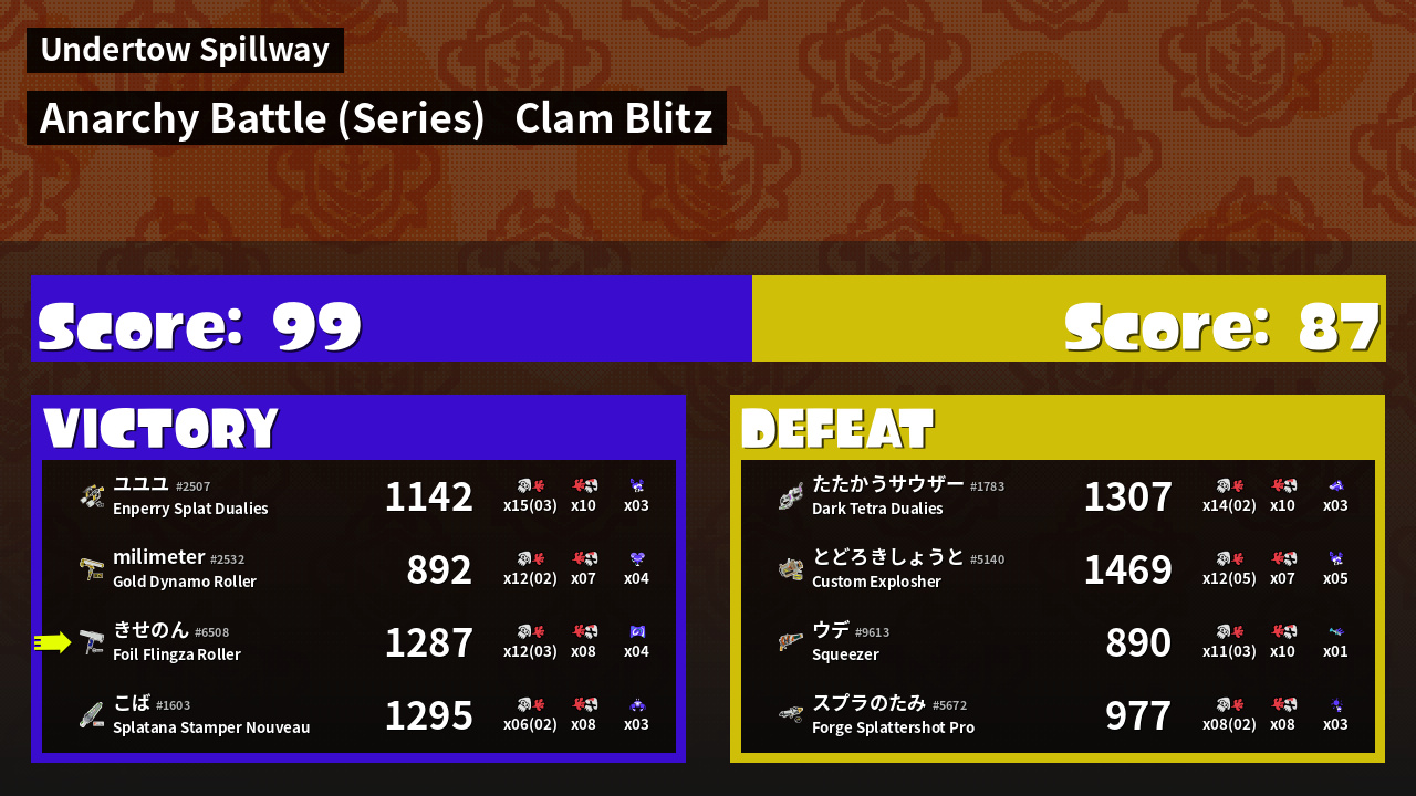 | Medals | #1 Super Jump Spot #1 Splat Assister #1 Clam Stopper | ||