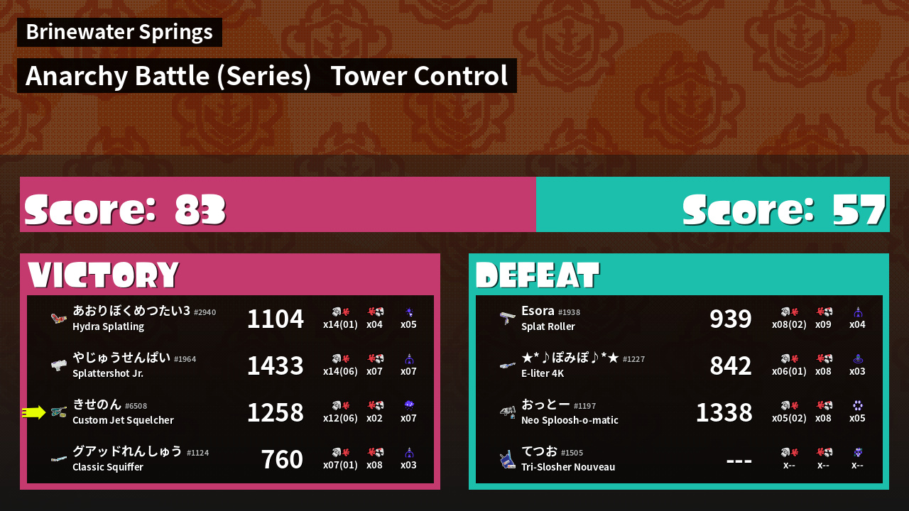 | Medals | #1 Splat Assister #1 Tower Stopper #1 Ground Traveler | ||