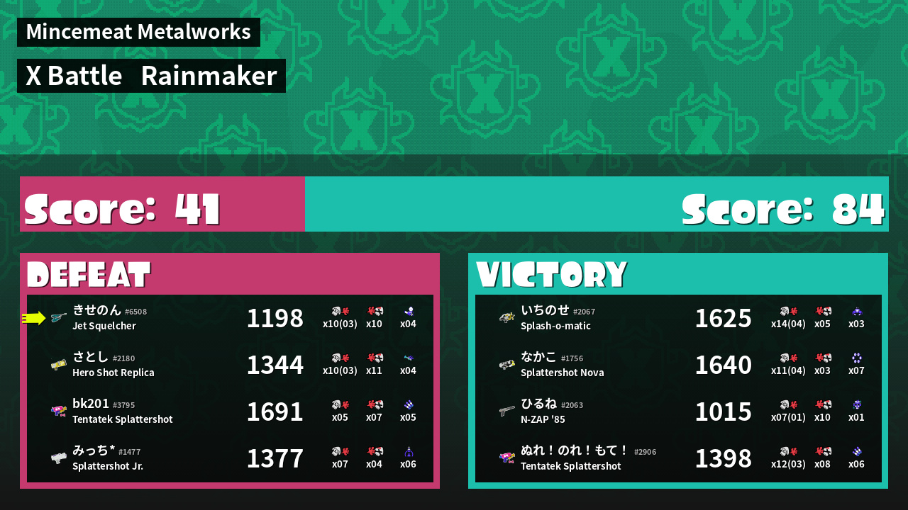 | Medals | #1 Overall Splatter #1 Enemy Splatter #1 Splat Assister | ||
