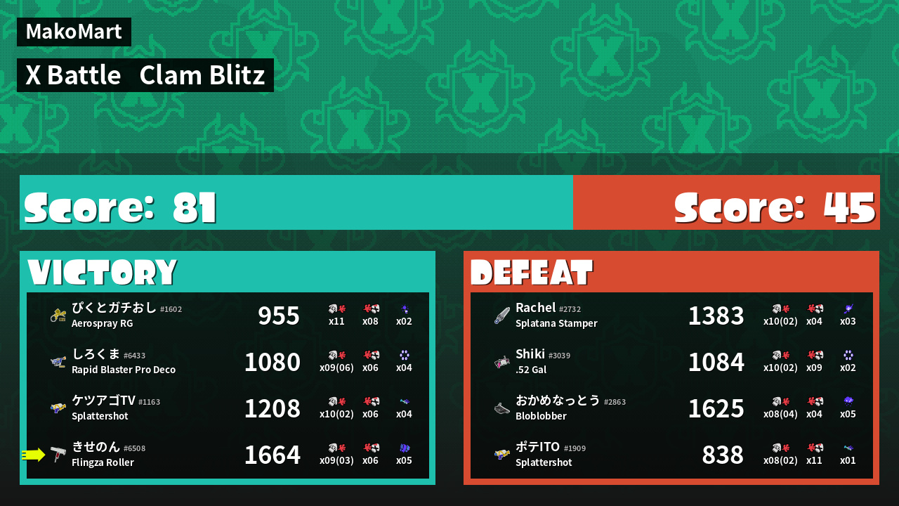 | Medals | #1 Turf Inker #1 Tenta Missiles User #2 Splat Assister | ||