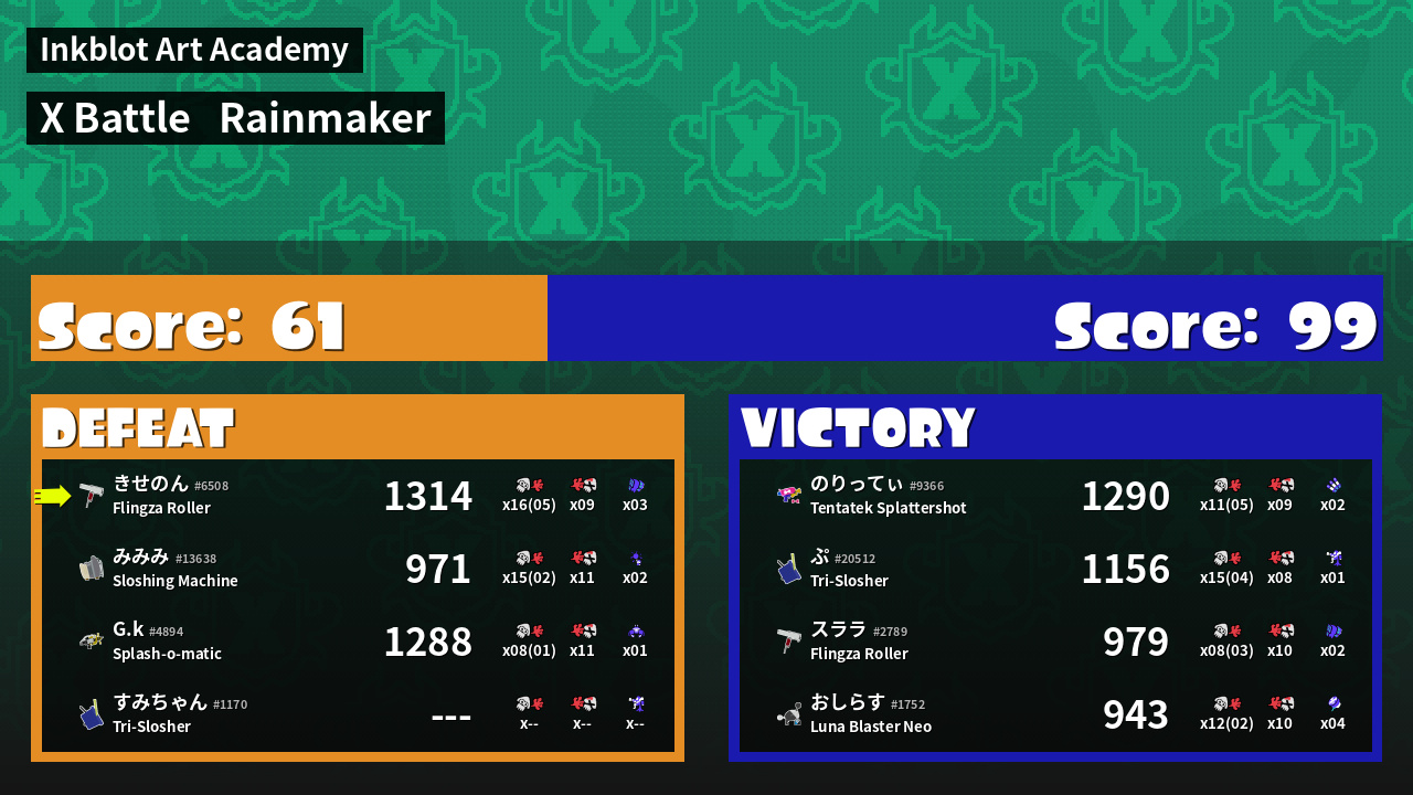 | Weapon | Flingza Roller ( Ink Mine / Tenta Missiles) | ||
