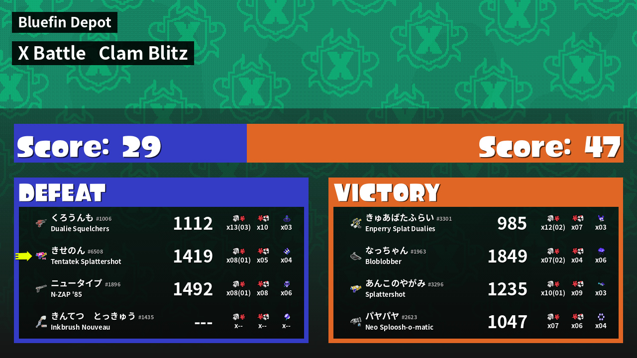 | Mode | Clam Blitz - X Battle | ||