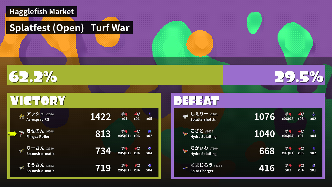 | Medals | #1 Overall Splatter #1 Popular Target #1 Enemy-Base Inker | ||