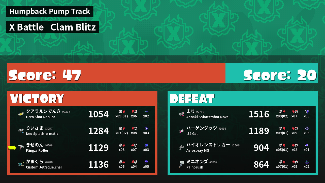 | Medals | #1 Clam Carrier #1 Enemy Splatter #1 Clam Stopper | ||